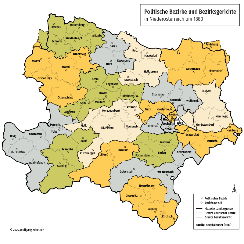 Bisher habe ich die Bezirksgerichte anhand eines Allgemeinen Verzeichnisses der Ortsgemeinden und Ortschaften von 1911 angegeben. Das hat den Vorteil, dass diese Einteilung auch die Bestandsstruktur der grundherrschaftlichen Quellen unter den Bezirksgerichten im NÖLA gut abbildet. Dort gibt es bereits die Bezirksgerichte Gmünd und Poysdorf. Das liegt wahrscheinlich am Übernahmezeitpunkt der Archivalien aus den Bezirksgerichten. Dies bildet aber nicht zwingend die Situation aus dem Jahr 1880 ab.