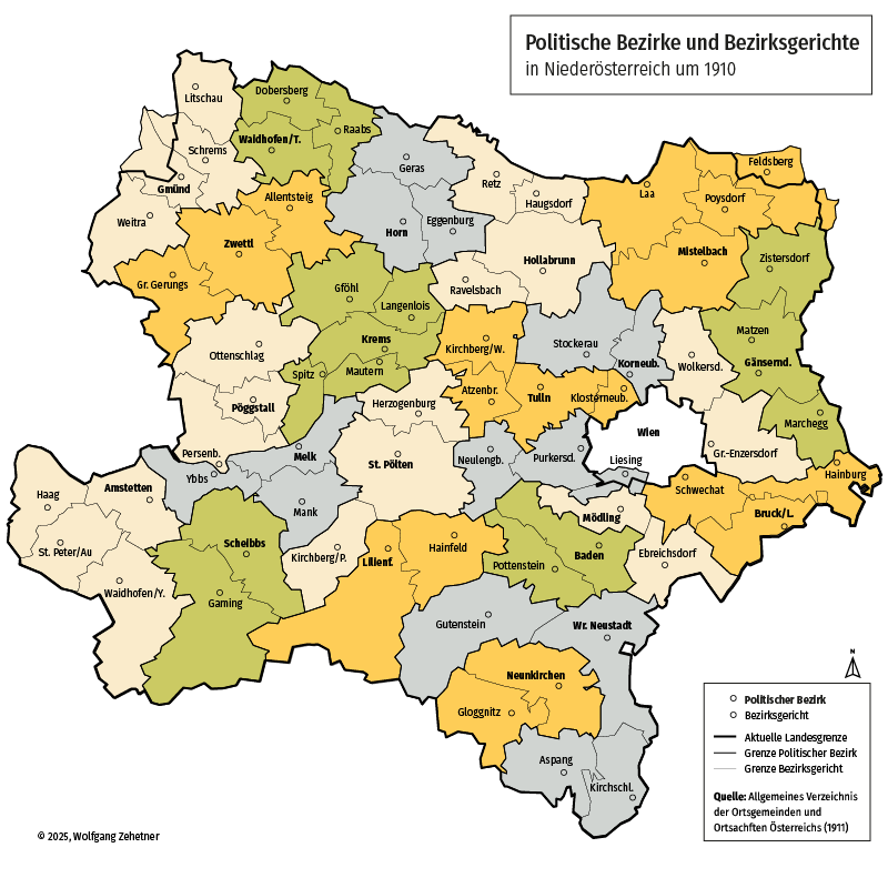 In dieser Zeitspanne entstanden die Bezirksgerichte Gmünd und Poysdorf. Die Politischen Bezirke wurden neu organisiert und es gab rund um Wien tiefgreifende Änderungen.